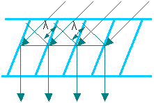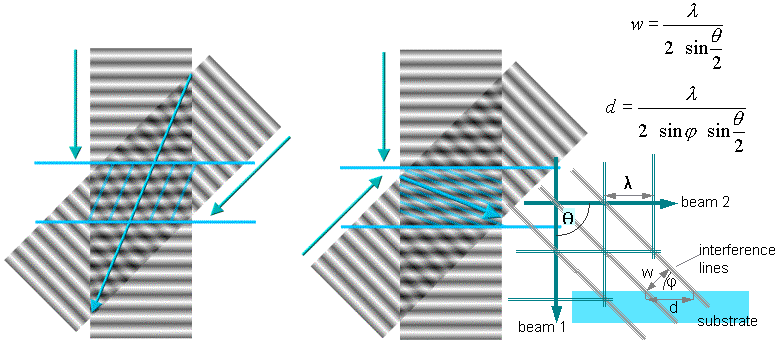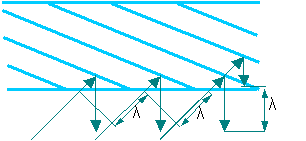 If we place a photo sensitive layer within the interference area. traveling light maxima (positive and negative ones, of course) are changing the material. In between, just zero transitions occur and nothing gets changed. The result are stacked layers, or planes, of different exposure. The drawing also shows an ultra simple approach how to derive the related Bragg Diffraction formulas.