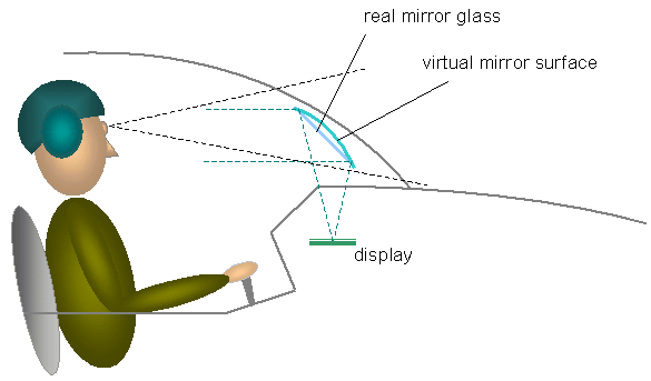 The mirror is a concave one, creating a virtual picture of the display at infinity. Hence, it stays in place against the horizon no matter where the pilot moves his head.