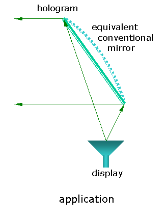 The holographic mirror resulting, will convert light from a display pixel into a beam from infinity. There is a range of angles for which this will work of course, not just a single one, otherwise this wouldn't work to depict the entire display. This range depends on the thickness of the hologram (the number of layers). In detail, the working principle of a holographic mirror can easily be visualized as follows:
