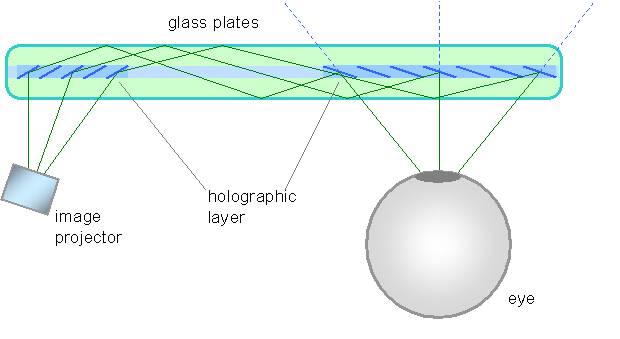 A new type of Augmented Reality display One major advantage of HOE's is their many degrees of freedom. Almost any beam conversion can be 'programmed' by just generating the right constructing beams. HOE's can also show extreme behavior especially at flat reflection angles. A new near-eye display by Lumus Inc. (picture) has a holographic film between glass plates (as usual with HOE's), having about identical refraction indices. Hence, very flat light beams can transgress the borders between glass and hologram almost unaffected, while at places where the film is modulated, they get reflected outside (or into) the plate. The freedom of construction allows to design the HOE for almost any input or output beam shapes desired.