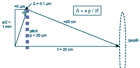 As we can easily see from the geometry depicted above, this is given even in a critical case, the spectator being very near to the display. The phase difference from one edge of one display pixel to the other (here 20 µm pixel size assumed) is only 0.1 µm, 1/4 the wavelength of blue light.